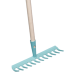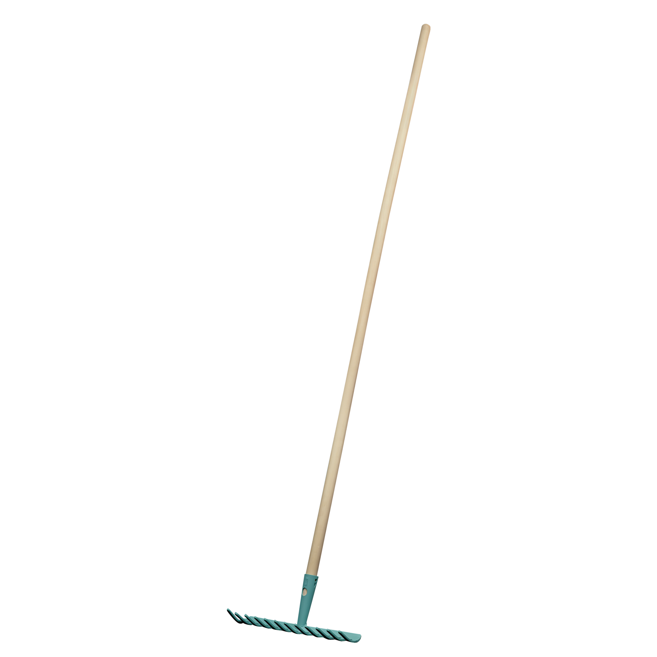 Perinteinen 16 piikkinen rautaharava puutarhan töihin. Laadukas ja lakattu varsi tekee työvälineestä mukavan tuntuisen käsissä.